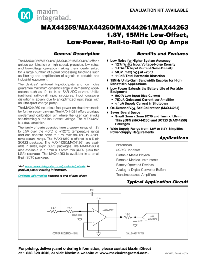 MAX44260, MAX44261, MAX44263 1.8V, 15MHz Low-Offset, Low-Power, Rail-to-Rail I/O Op Amps