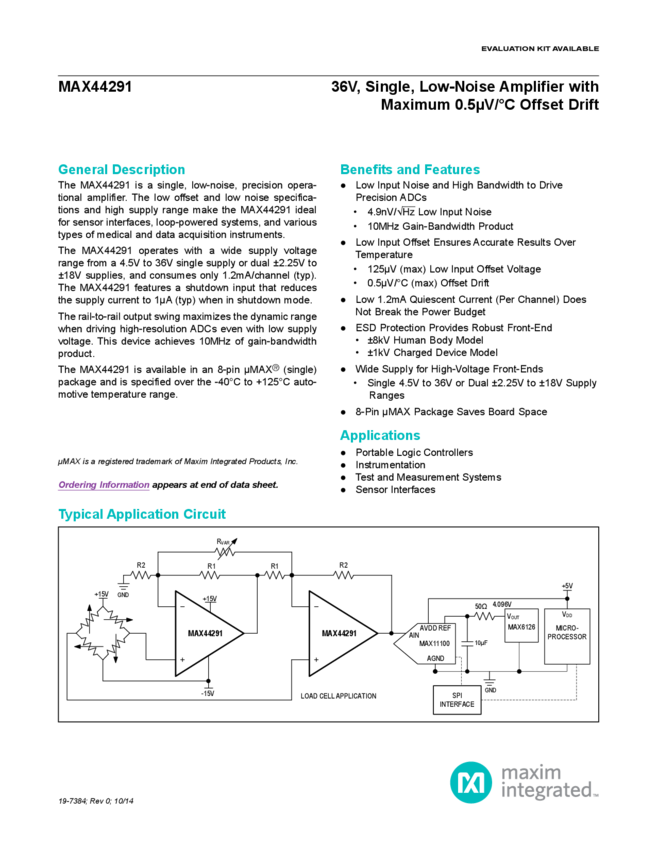 MAX44291 36V, Precision, Low-Noise Amplifier