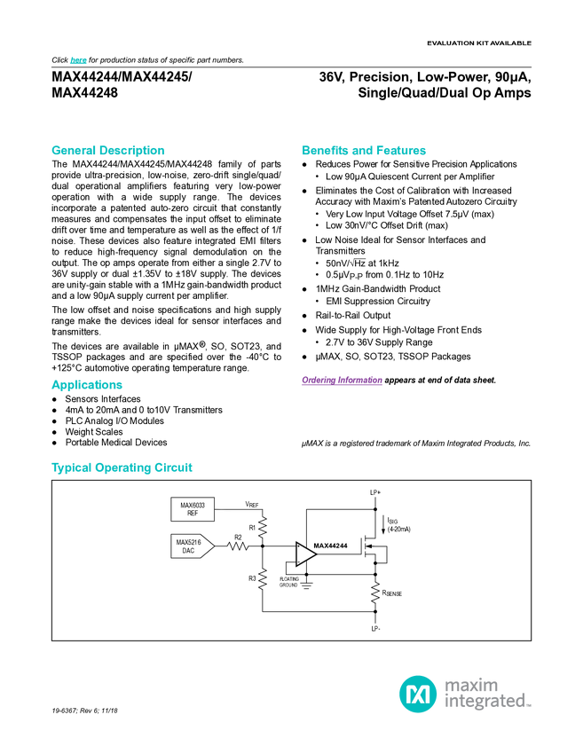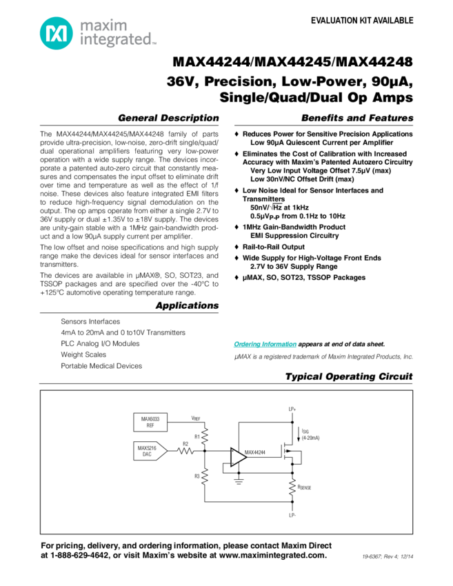 MAX44244, MAX44245, MAX44248 36V, Precision, Low-Power, 90µA, Single/Quad/Dual Op Amps