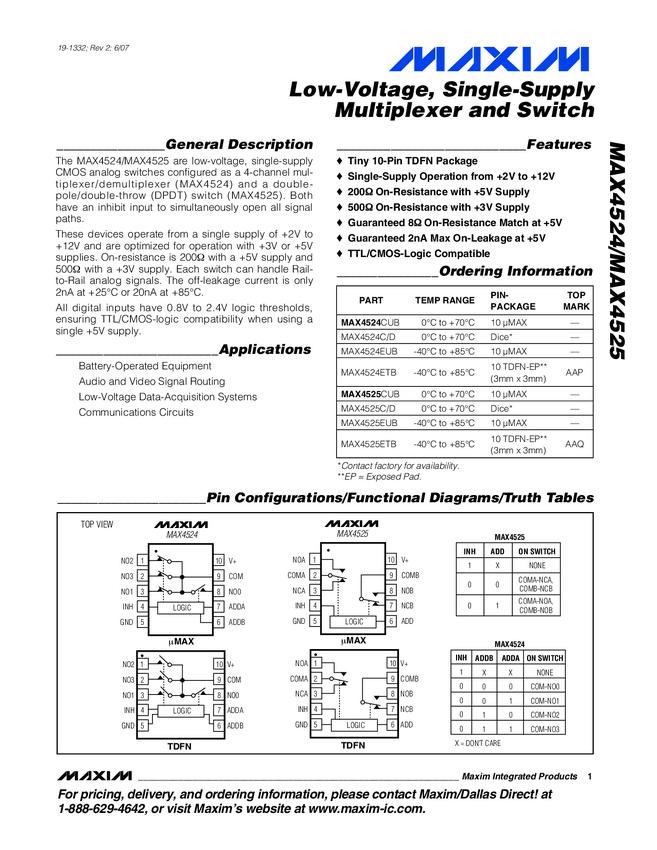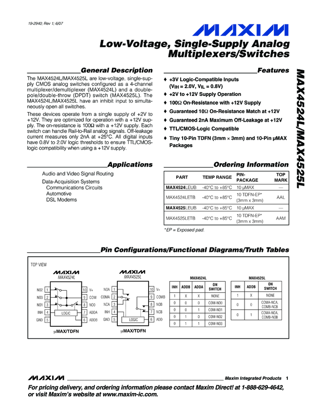 MAX4524L, MAX4525L Low-Voltage, Single-Supply Analog Multiplexers/Switches