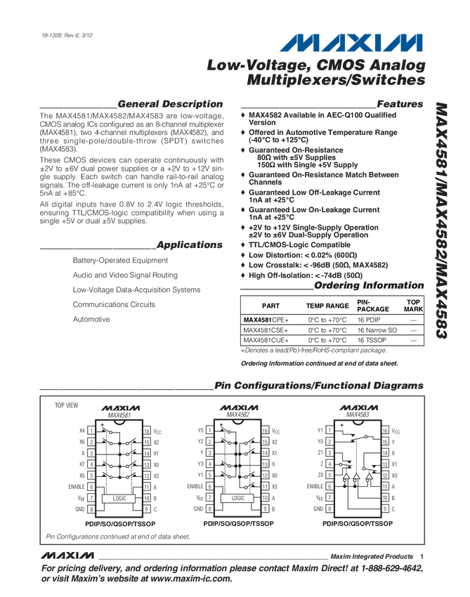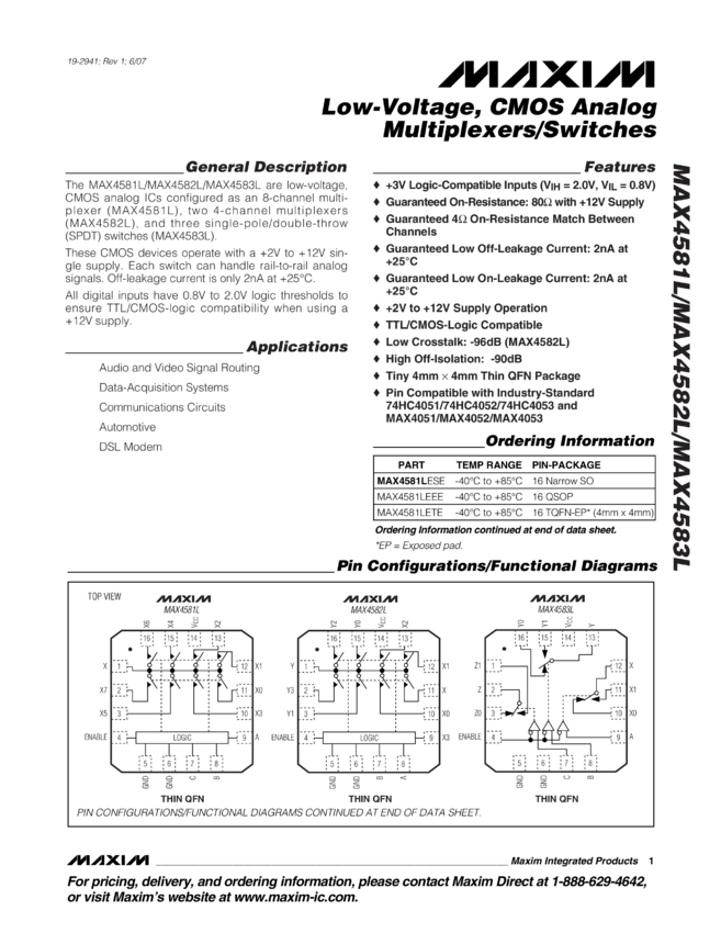 MAX4581L, MAX4582L, MAX4583L Low-Voltage, CMOS Analog Multiplexers/Switches