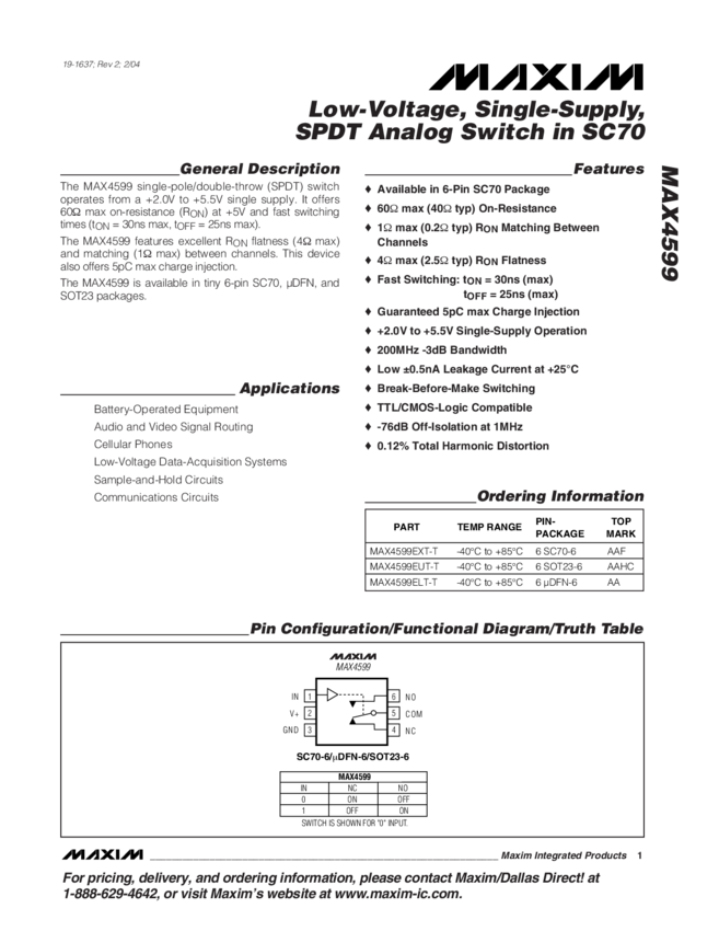 MAX4599 Low-Voltage, Single-Supply, SPDT Analog Switch in SC70