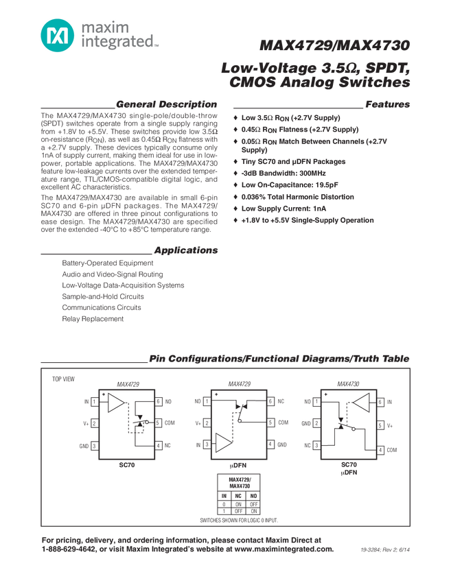 MAX4729, MAX4730 Low-Voltage 3.5Ω, SPDT, CMOS Analog Switches