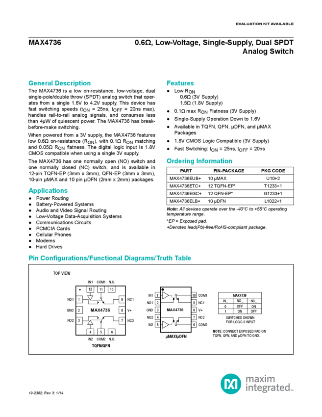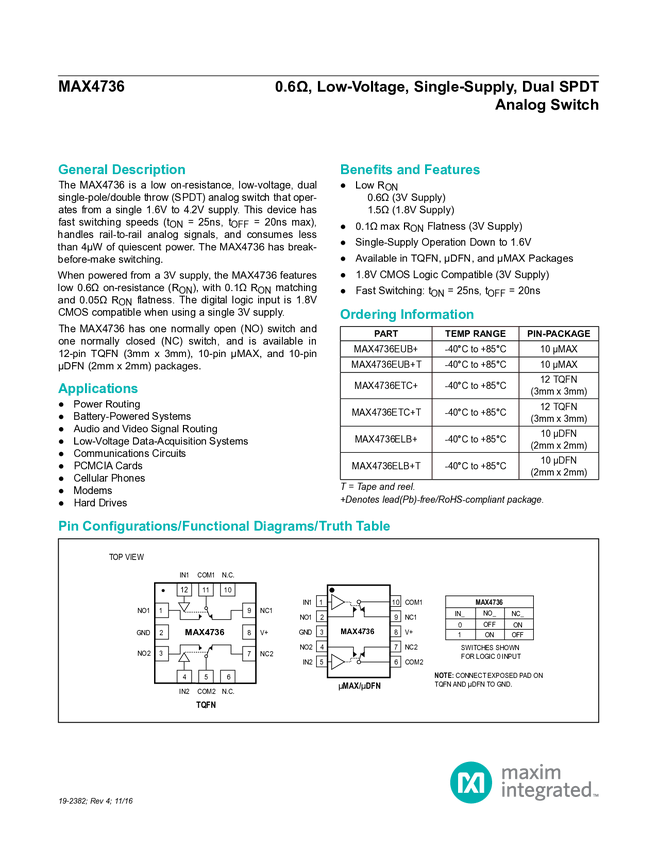 MAX4736 0.6 Ohm, Low-Voltage, Single-Supply, Dual SPDT Analog Switch