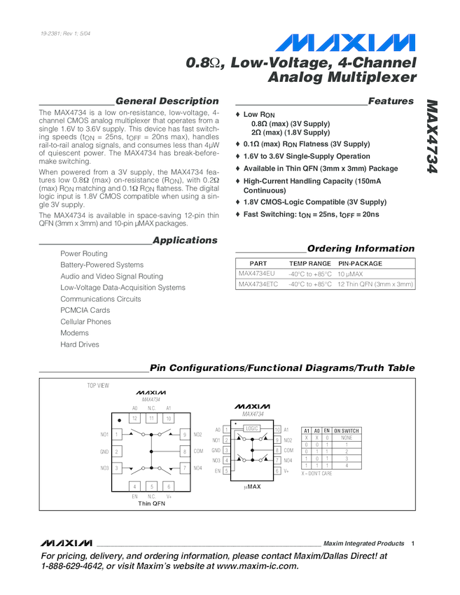 MAX4734 0.8 ohm, Low-Voltage, 4-Channel Multiplexer