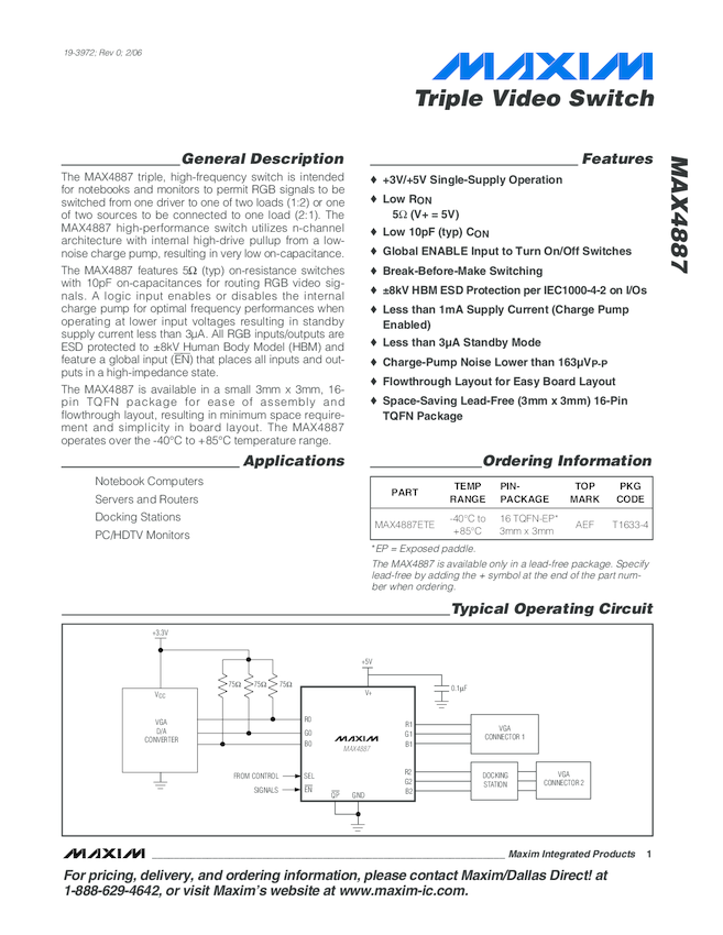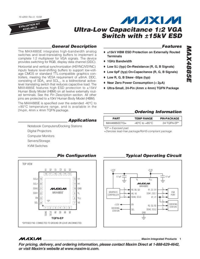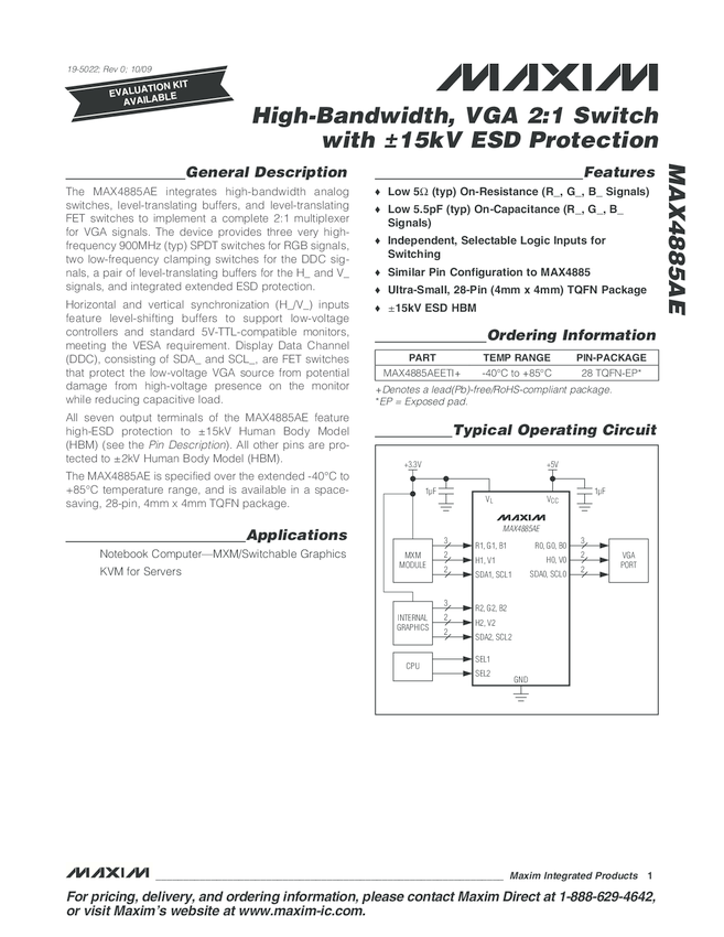 MAX4885AE High Bandwidth, 2:1 VGA Switch with +/-15kV ESD Protection
