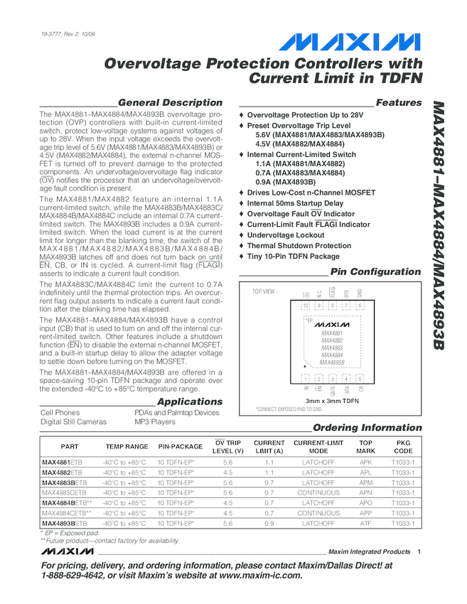 MAX4884 Overvoltage Protection Controller with Current-Limit in TDFN