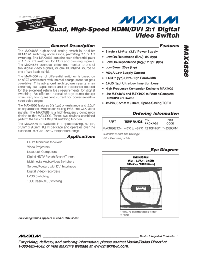 MAX4886 Quad, High-Speed HDMI/DVI 2:1 Digital Video Switch