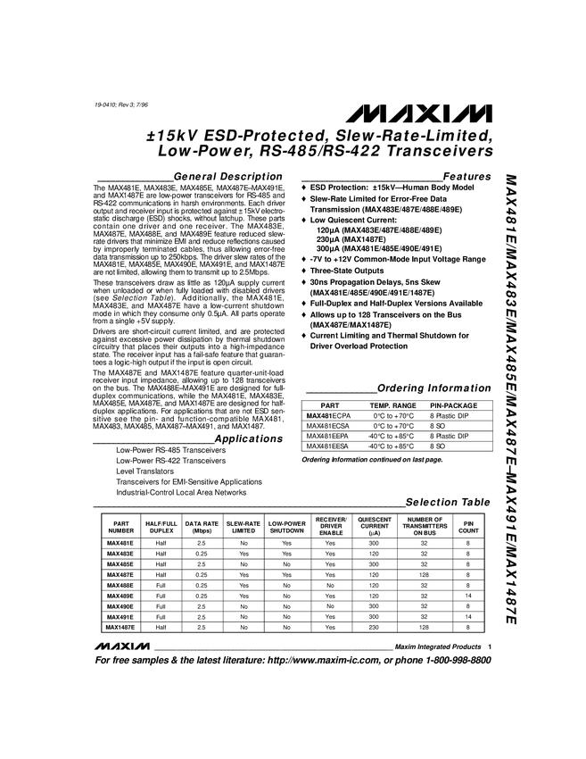 MAX1487E, MAX481E, MAX483E, MAX485E, MAX487E, MAX488E, MAX489E, MAX490E, MAX491E ±15kV ESD-Protected, Slew-Rate-Limited, Low-Power, RS-485/RS-422 Transceivers