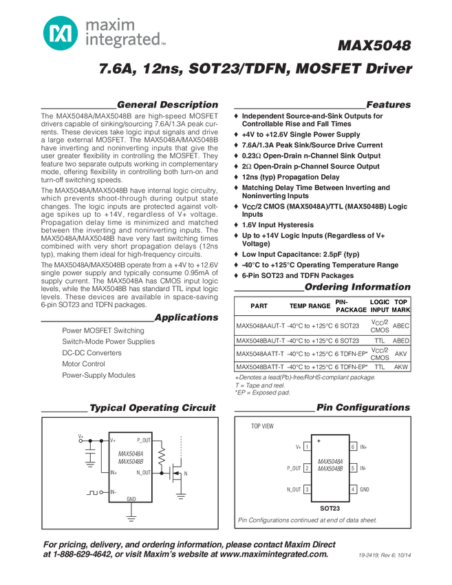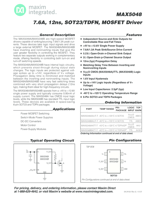 MAX5048A, MAX5048B 7.6A, 12ns, SOT23/TDFN MOSFET Driver