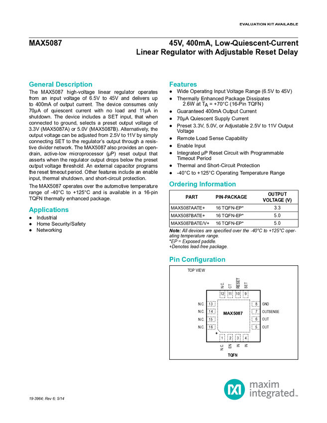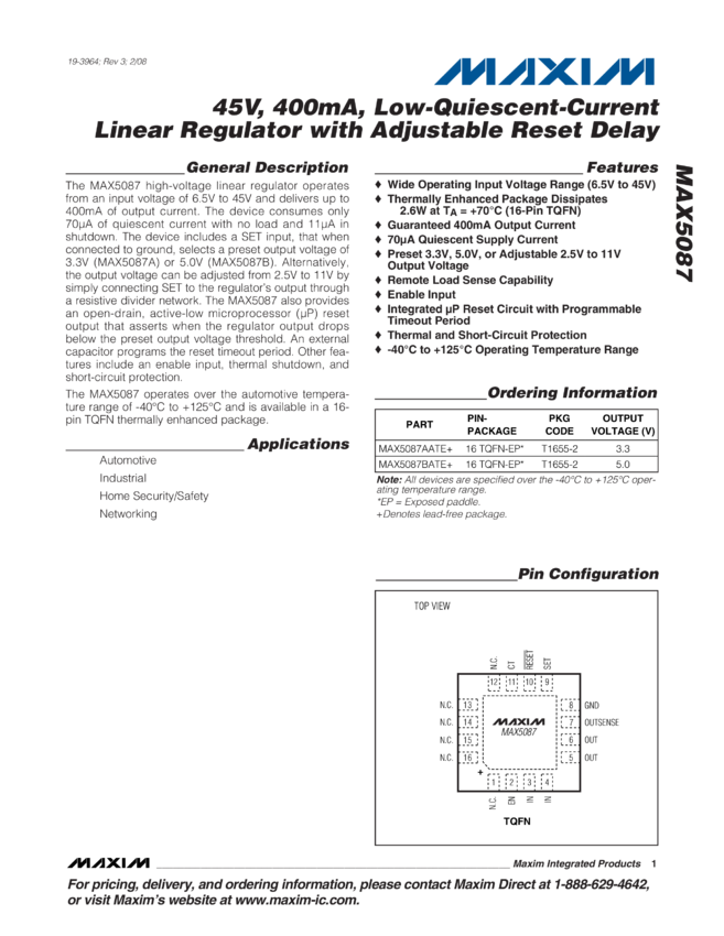 MAX5087 45V, 400mA, Low-Quiescent-Current Linear Regulator with Adjustable Reset Delay