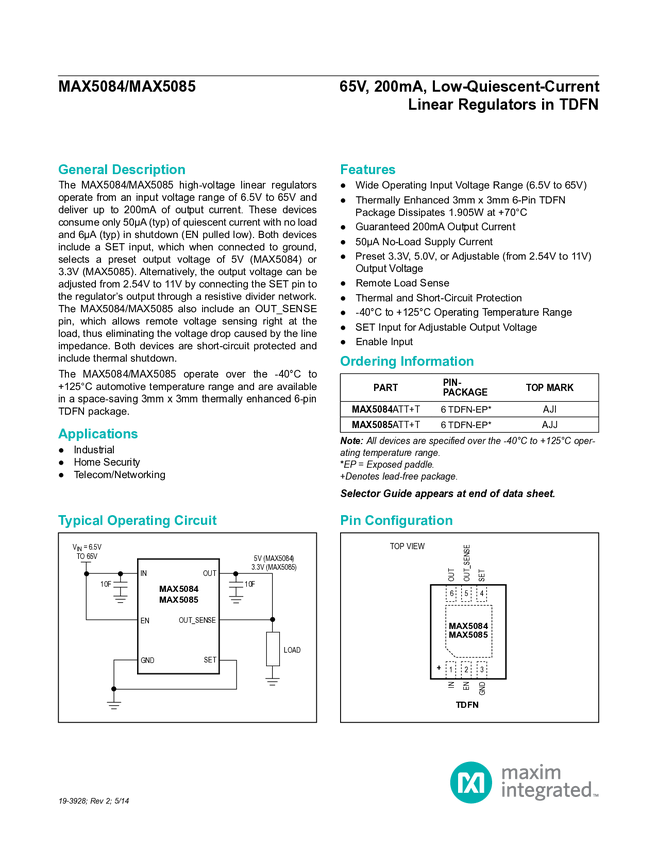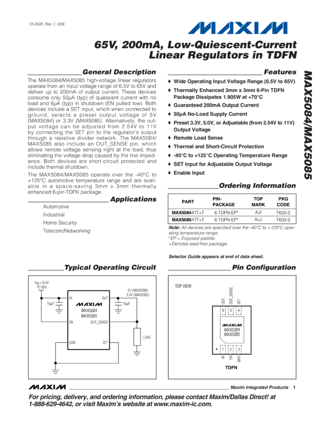 MAX5084, MAX5085 65V, 200mA, Low-Quiescent-Current Linear Regulators in TDFN