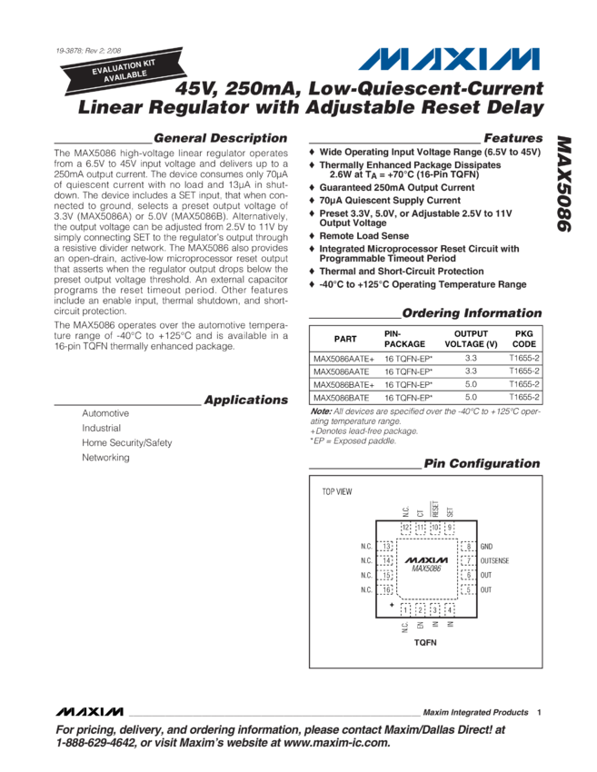 MAX5086 45V, 250mA, Low-Quiescent-Current Linear Regulator with Adjustable Reset Delay