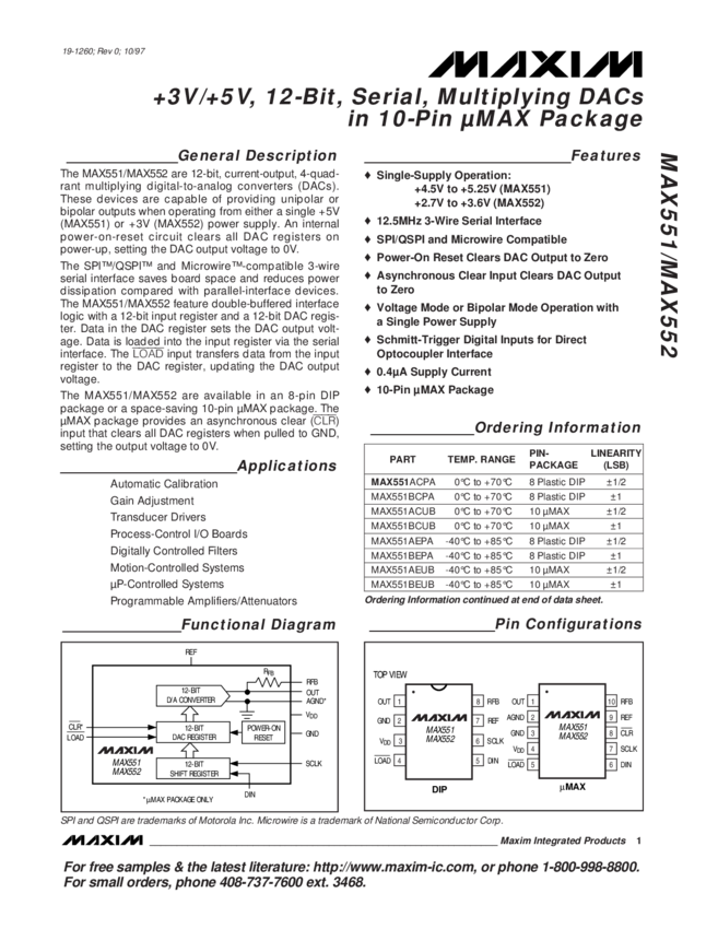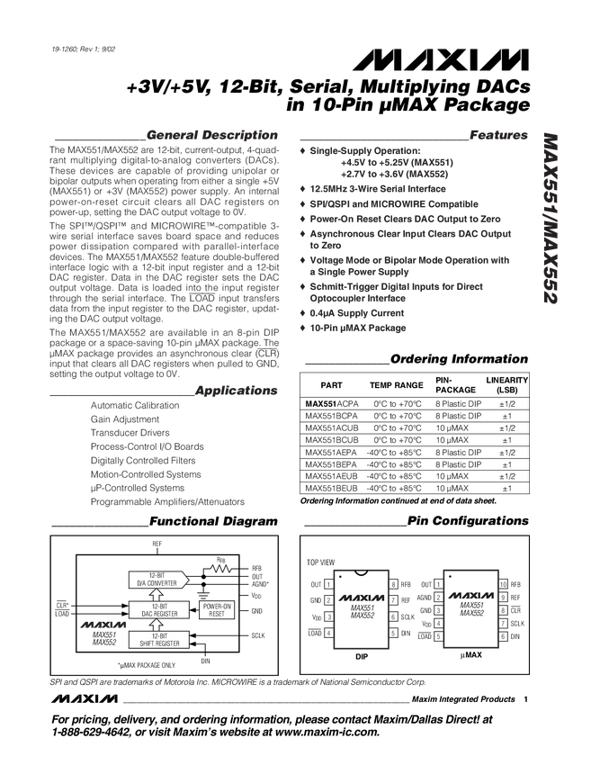 +3V/+5V, 12-Bit, Serial, Multiplying DACs in 10-Pin µMAX Package