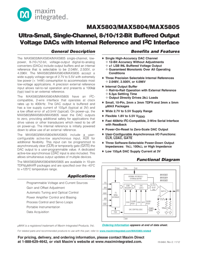 MAX5803, MAX5804, MAX5805 Ultra-Small, Single-Channel, 8-/10-/12-Bit Buffered Output Voltage DACs with Internal Reference and I²C Interface