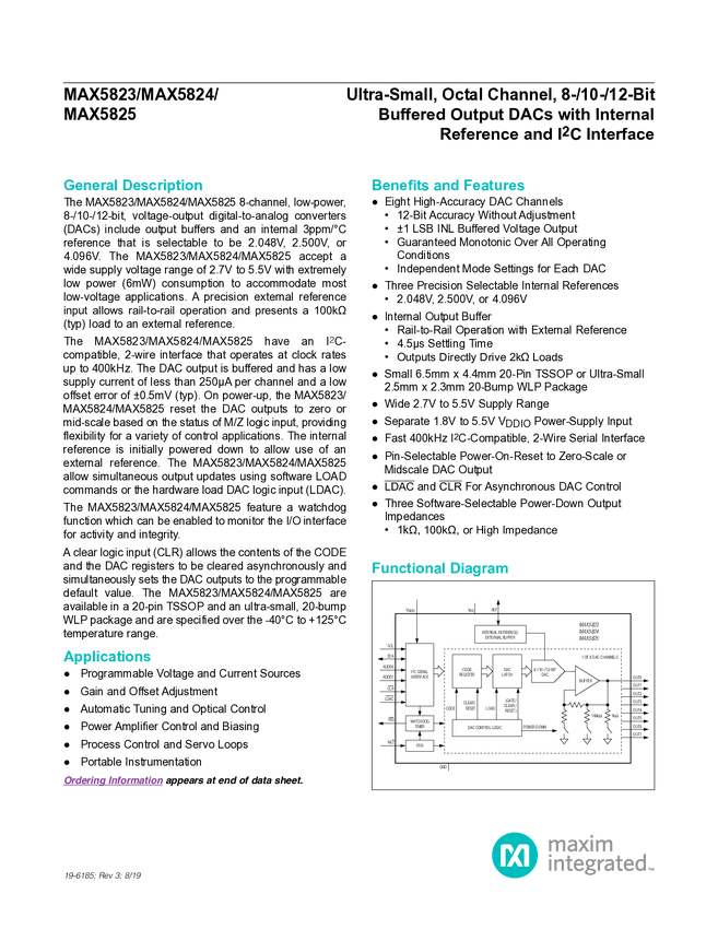 MAX5823, MAX5824, MAX5825 Ultra-Small, Octal Channel, 8-/10-/12-Bit Buffered Output DACs with Internal Reference and I²C Interface