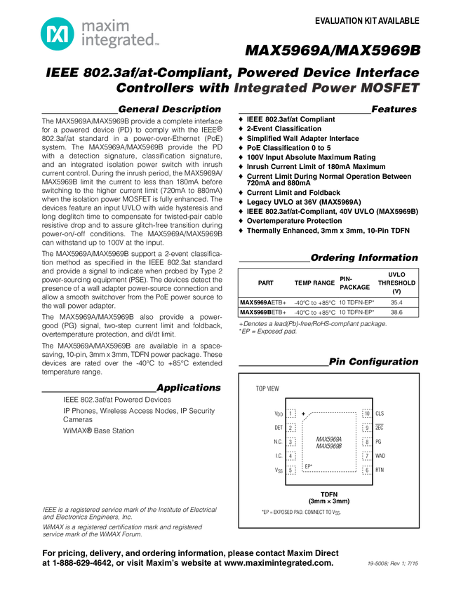 MAX5969A, MAX5969B IEEE 802.3af/at-Compliant, Powered Device Interface Controllers with Integrated Power MOSFET