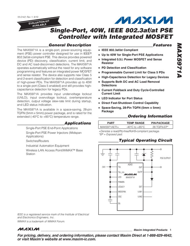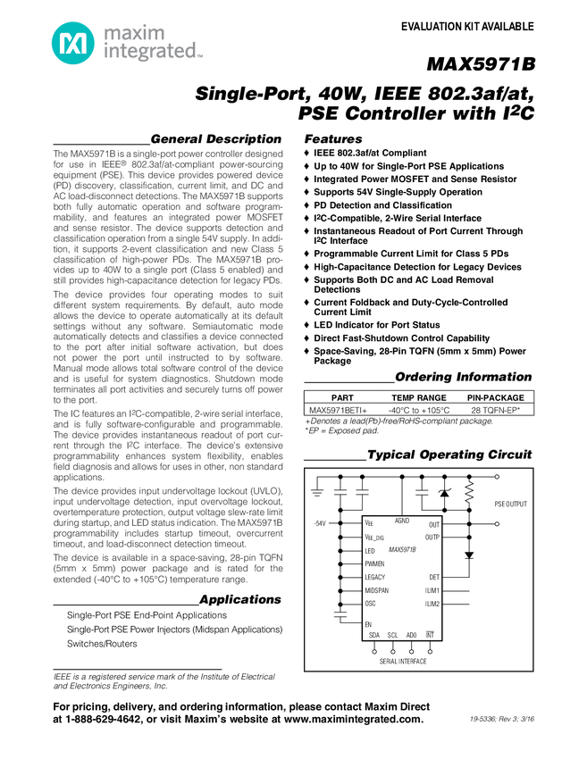 MAX5971B Single-Port, 40W, IEEE 802.3af/at, PSE Controller with I&#178C