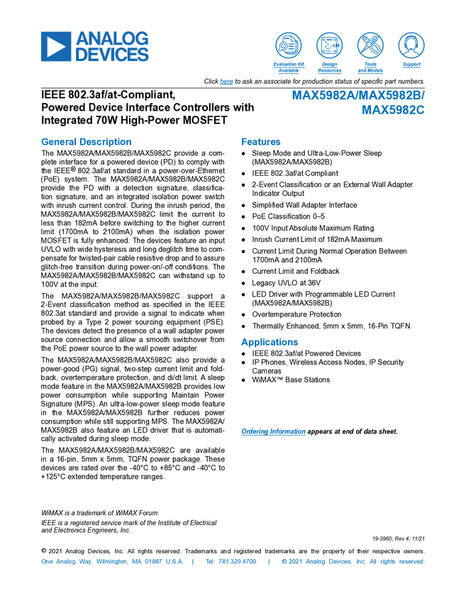 MAX5982A, MAX5982B, MAX5982C IEEE 802.3af/at-Compliant, Powered Device Interface Controllers with Integrated 70W High-Power MOSFET
