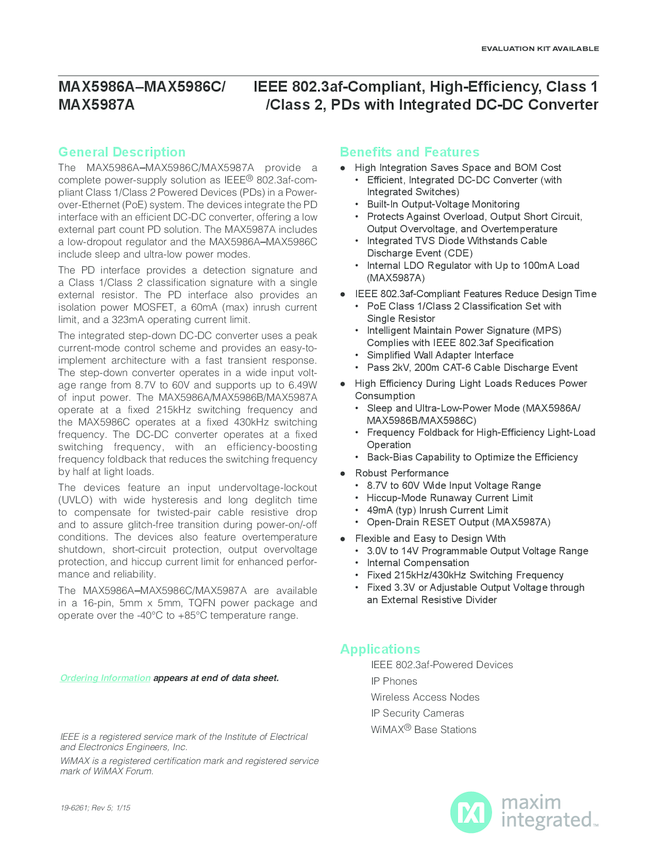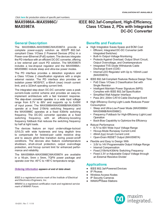 MAX5986A, MAX5987A IEEE 802.3af-Compliant, High-Efficiency, Class 1, Powered Devices with Integrated DC-DC Converter