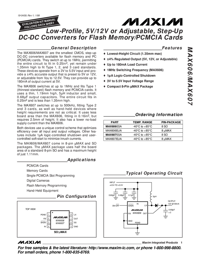 Low-Profile, 5V/12V or Adjustable, Step-Up DC-DC Converter for Flash Memory PCMCIA Cards