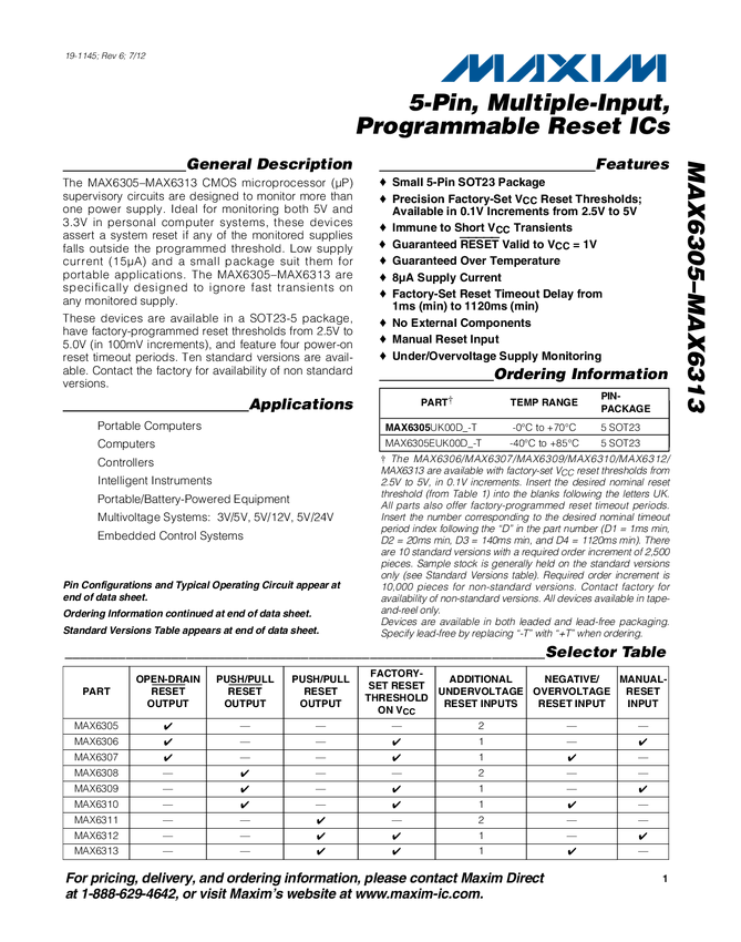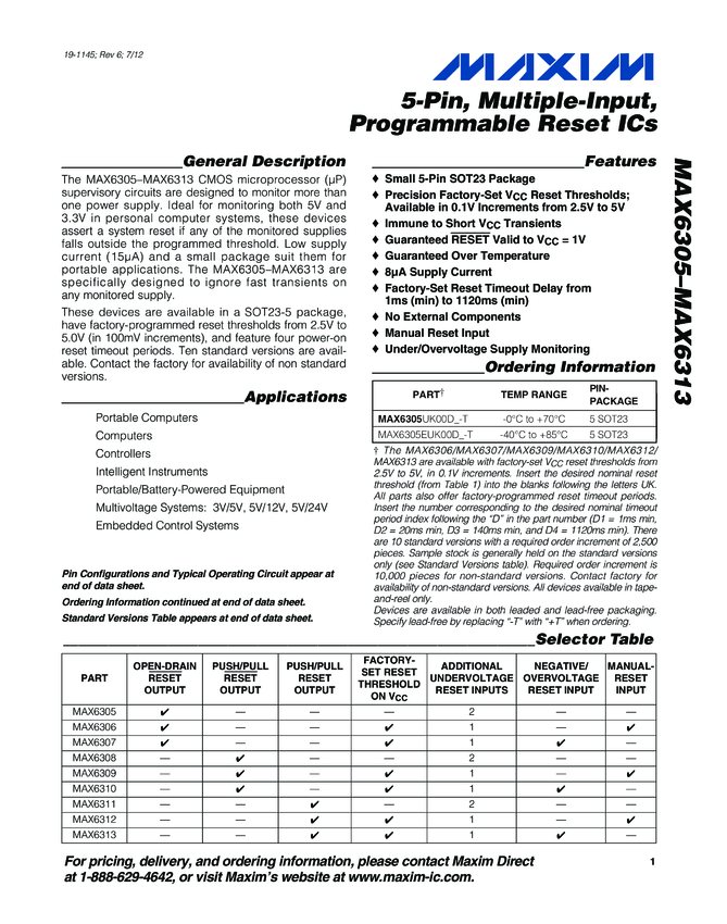 MAX6305, MAX6306, MAX6307, MAX6308, MAX6309, MAX6310, MAX6311, MAX6312, MAX6313 5-Pin, Multiple-Input, Programmable Reset ICs