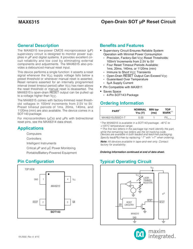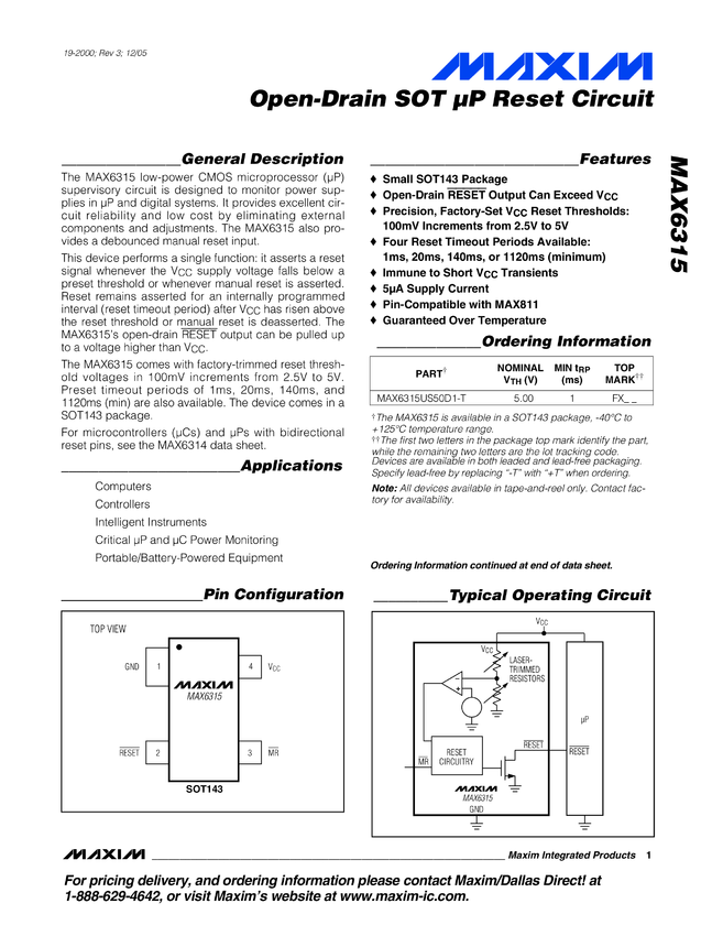 MAX6315 Open-Drain SOT µP Reset Circuit