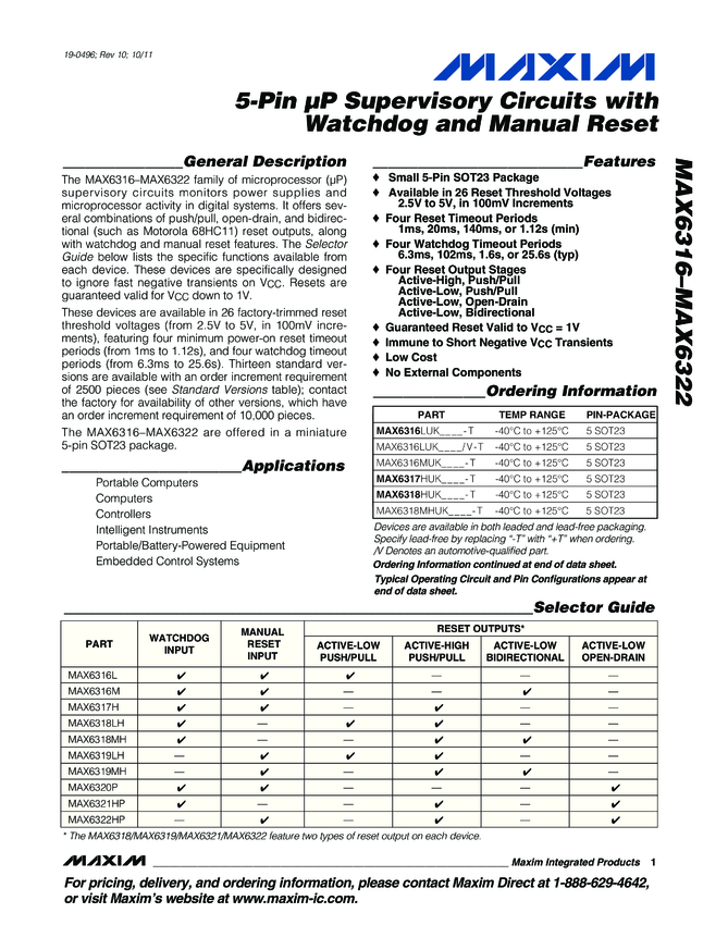 MAX6316, MAX6316M, MAX6317, MAX6318, MAX6319, MAX6320, MAX6321, MAX6322 5-Pin µP Supervisory Circuits with Watchdog and Manual Reset