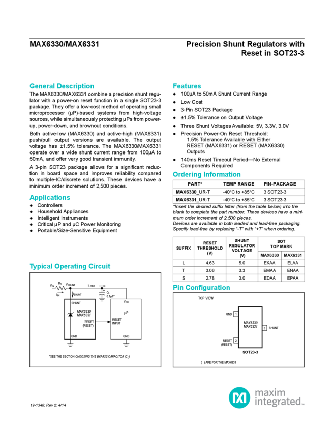 MAX6330, MAX6331 Precision Shunt Regulators with Reset in SOT23-3