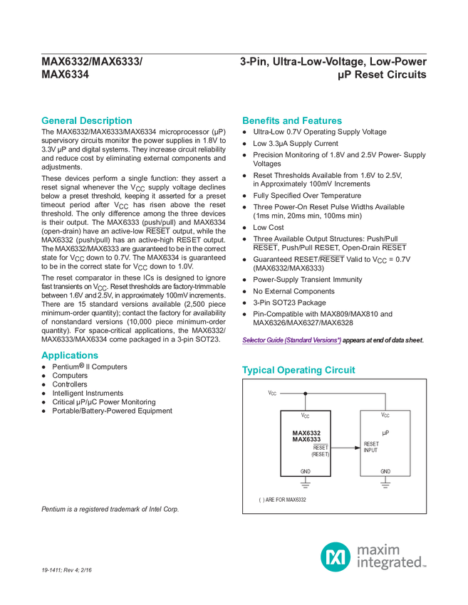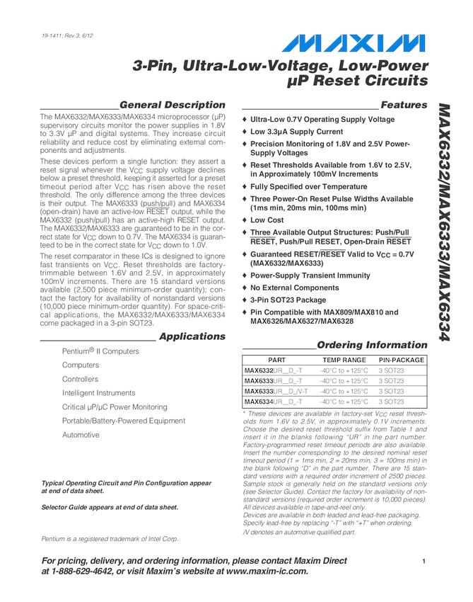 MAX6334 3-Pin, Ultra-Low-Voltage, Low-Power &#181P Reset Circuit with Open-Drain /RESET