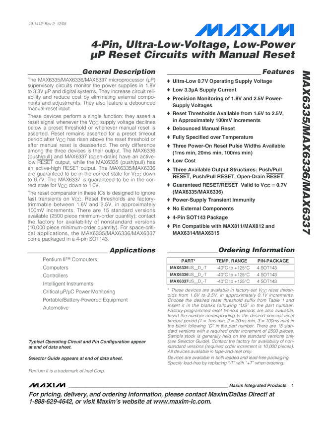 MAX6337 4-Pin, Ultra-Low-Voltage, Low-Power &#181P Reset Circuit with Manual Reset and Open-Drain /RESET