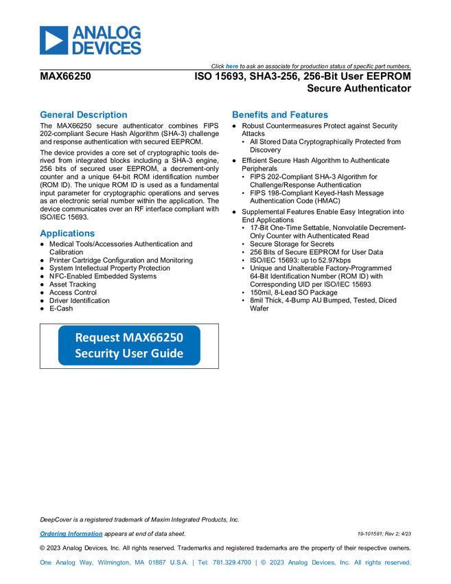 ISO 15693, SHA3-256, 256-Bit User EEPROM Secure Authenticator