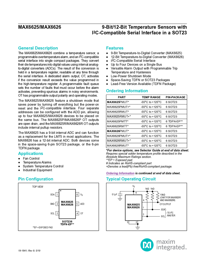 MAX6625, MAX6626 9-Bit/12-Bit Temperature Sensors with I²C-Compatible Serial Interface in a SOT23