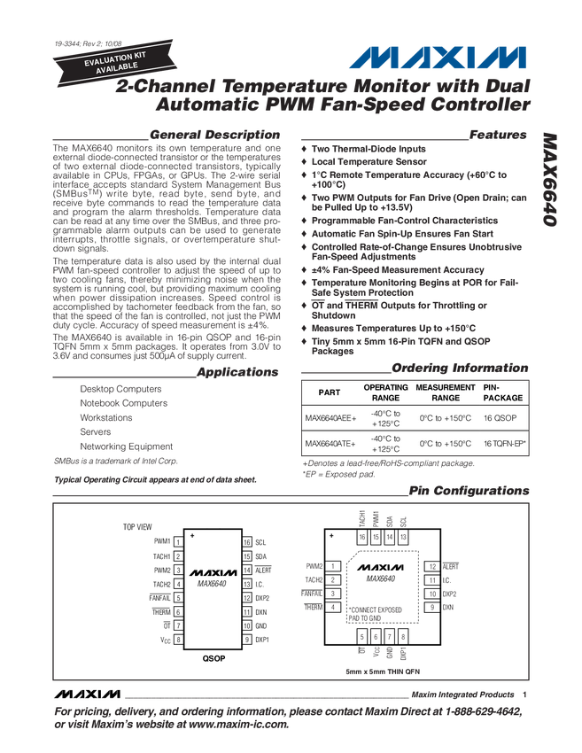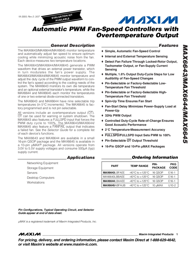 MAX6645 Automatic PWM Fan-Speed Controllers with Overtemperature Output