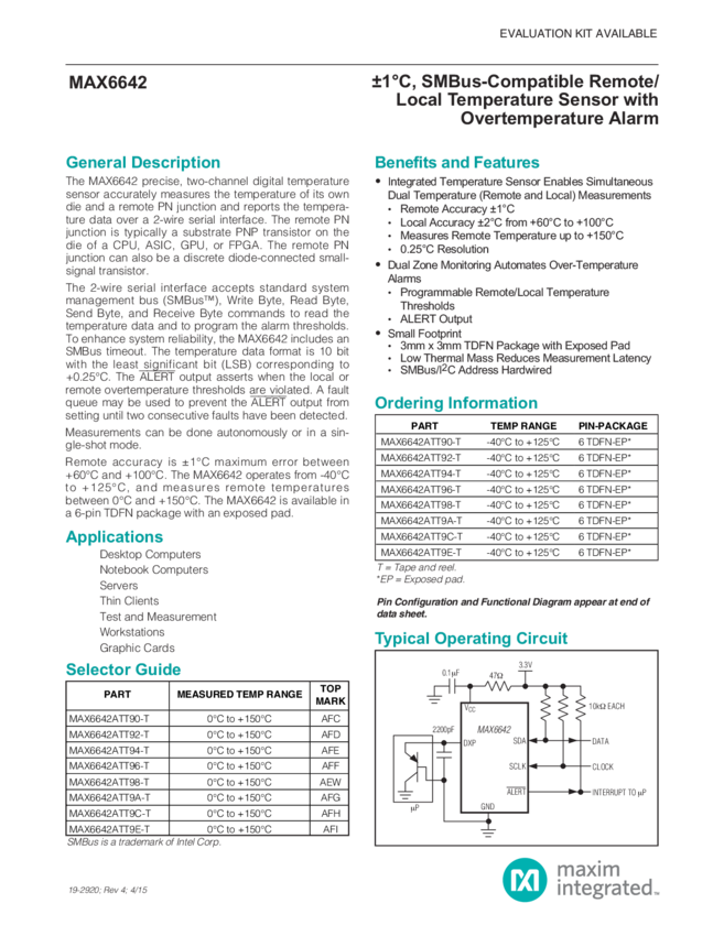 MAX6642 &#1771&#176C, SMBus-Compatible Remote/Local Temperature Sensor with Overtemperature Alarm