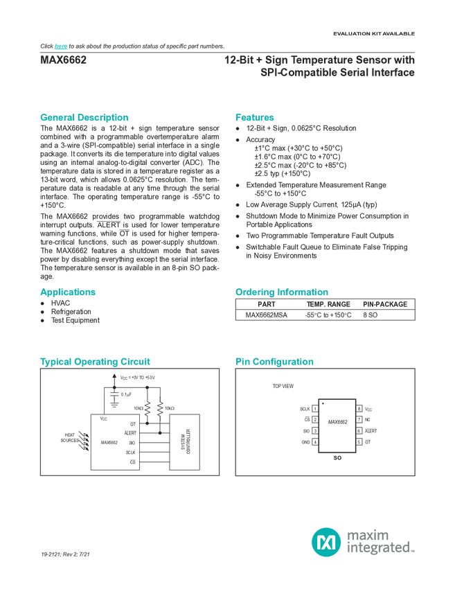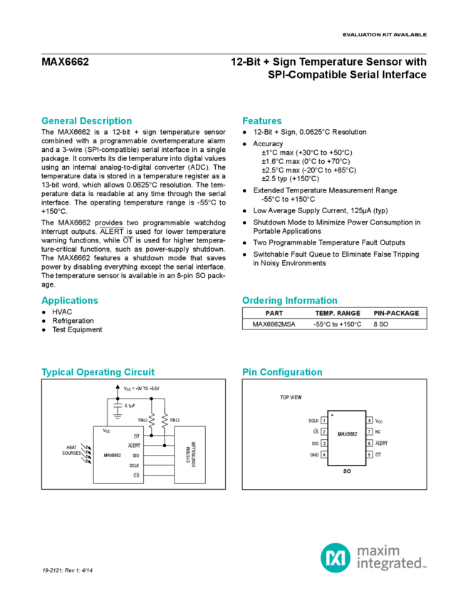 MAX6662 12-Bit Plus Sign Temperature Sensor with SPI-Compatible Serial Interface