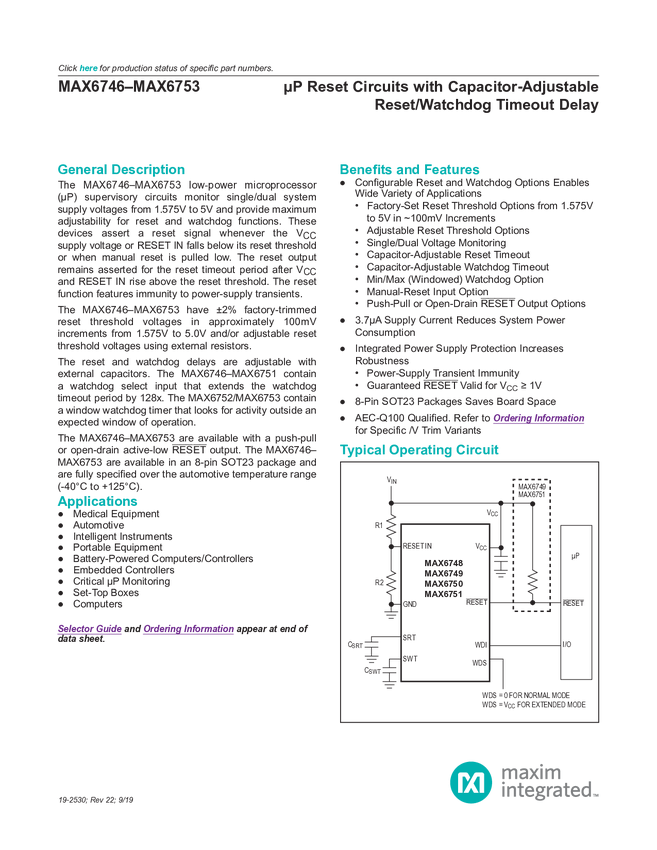 MAX6746, MAX6747, MAX6748, MAX6749, MAX6750, MAX6751, MAX6752, MAX6753 µP Reset Circuits with Capacitor-Adjustable Reset/Watchdog Timeout Delay
