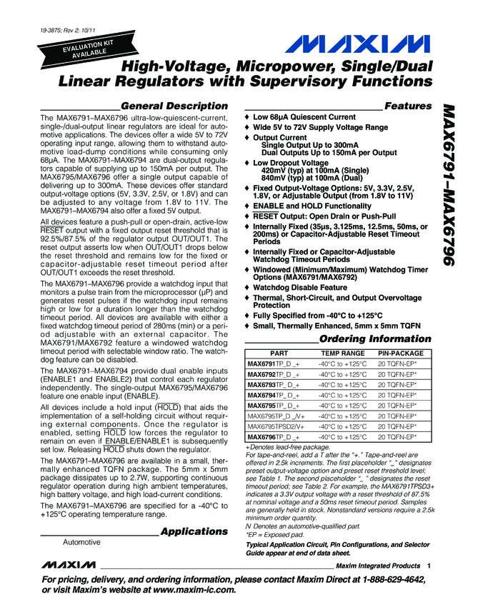 MAX6791, MAX6792, MAX6793, MAX6794, MAX6795, MAX6796 High-Voltage, Micropower, Single/Dual Linear Regulators with Supervisory Functions