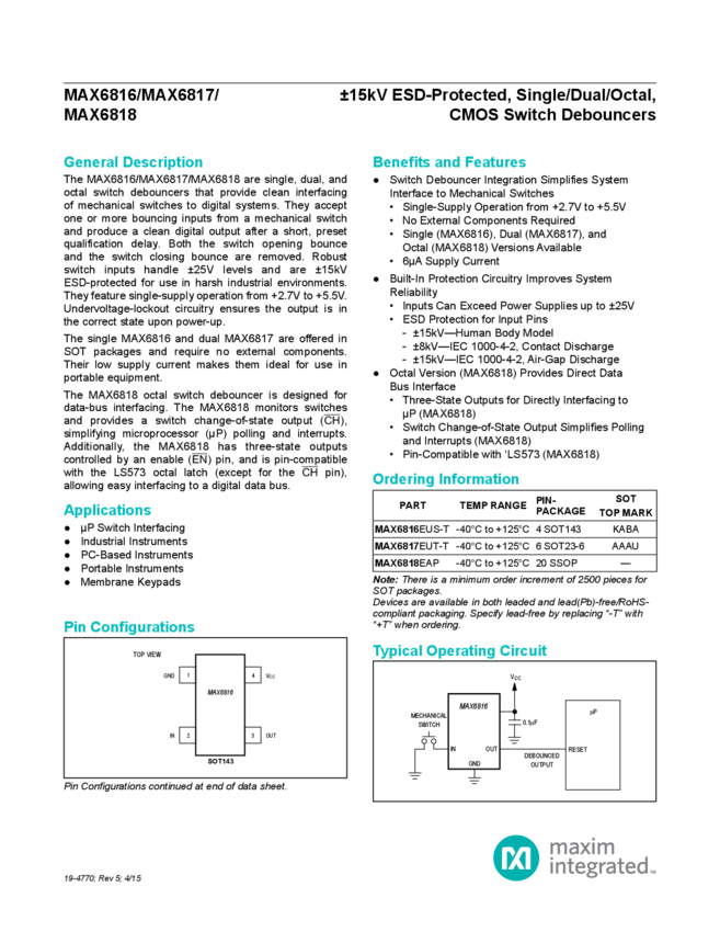 MAX6816, MAX6817, MAX6818 ±15kV ESD-Protected, Single/Dual/Octal, CMOS Switch Debouncers