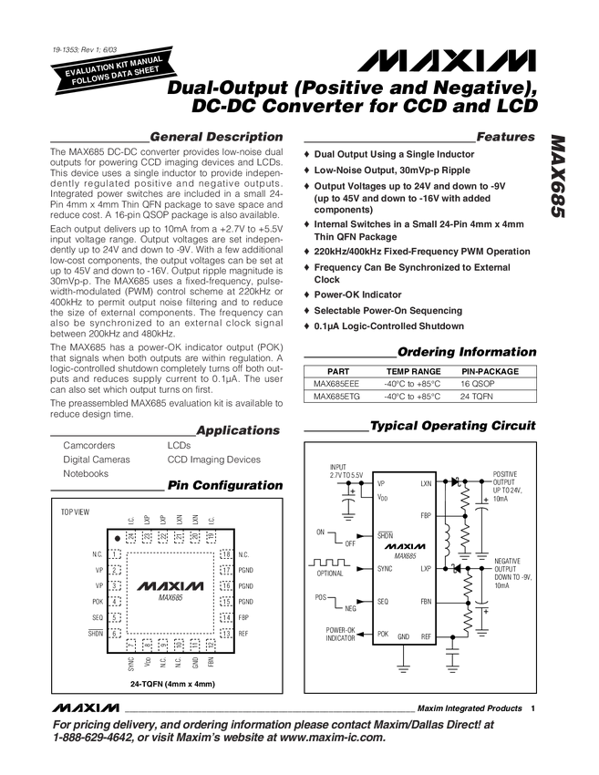 Dual-Output (Positive and Negative), DC-DC Converter for CCD and LCD