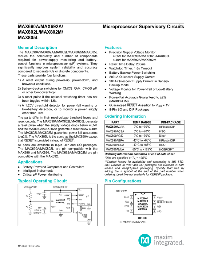 MAX690A, MAX692A, MAX802L, MAX802M, MAX805L Microprocessor Supervisory Circuits