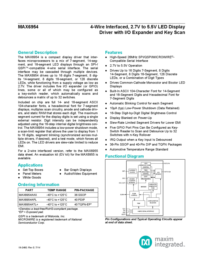 MAX6954 4-Wire Interfaced, 2.7V to 5.5V LED Display Driver with I/O Expander and Key Scan