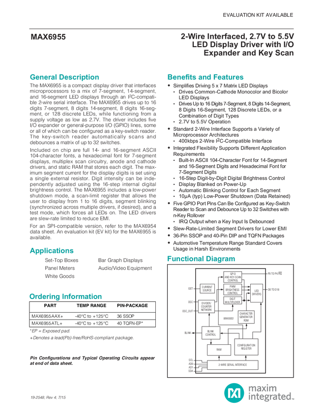 MAX6955 2-Wire Interfaced, 2.7V to 5.5V LED Display Driver with I/O Expander and Key Scan