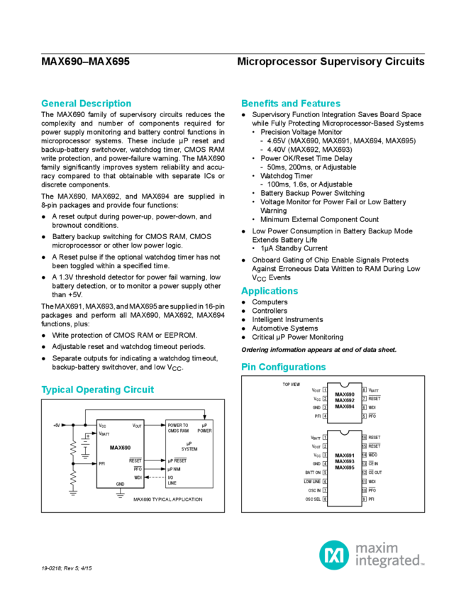 MAX690, MAX691, MAX692, MAX693, MAX694, MAX695 Microprocessor Supervisory Circuits