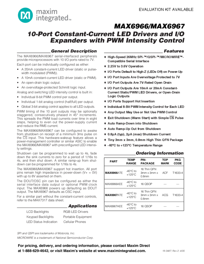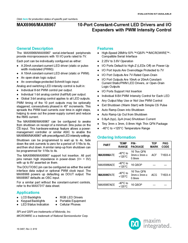 MAX6966, MAX6967 10-Port Constant-Current LED Drivers and I/O Expanders with PWM Intensity Control