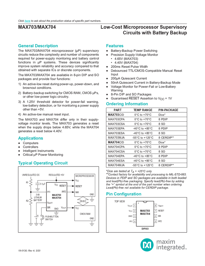 MAX703, MAX704 Low-Cost Microprocessor Supervisory Circuits with Battery Backup