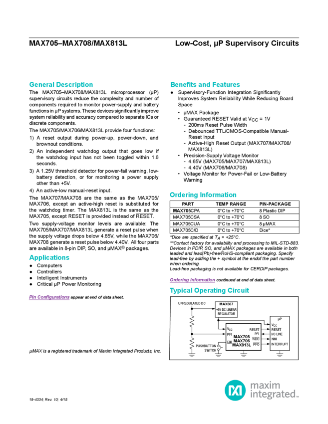 MAX705, MAX706, MAX707, MAX708, MAX813, MAX813L Low-Cost, µP Supervisory Circuits