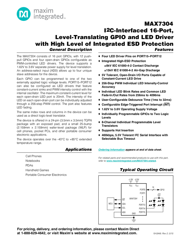 MAX7304 I²C-Interfaced 16-Port, Level-Translating GPIO and LED Driver with High Level of Integrated ESD Protection