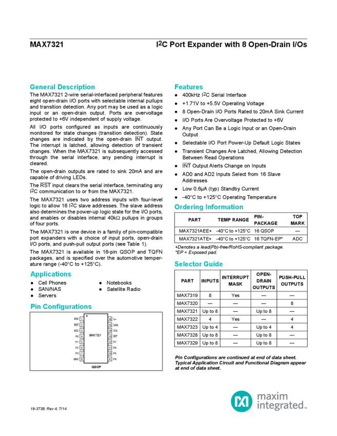 MAX7321 I²C Port Expander with 8 Open-Drain I/Os