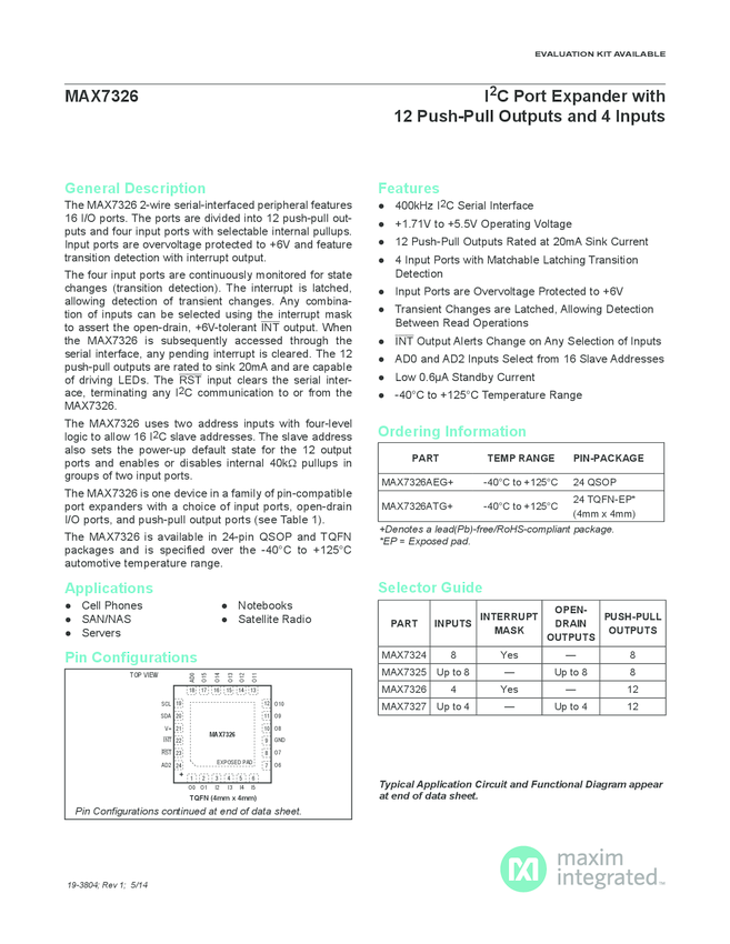 MAX7326 I2C Port Expander with 12 Push-Pull Outputs and 4 Inputs